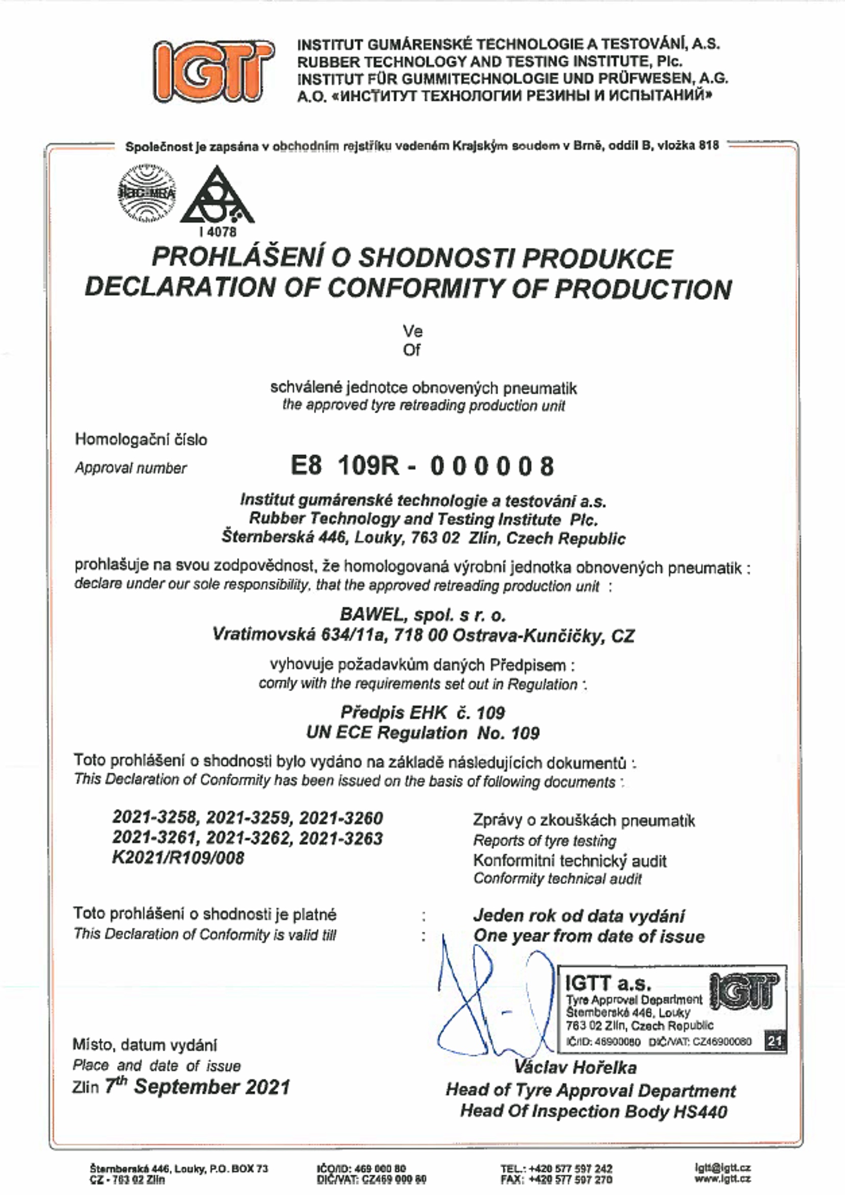 IGTT - Prohlášení o shodnosti produkce EHK 109